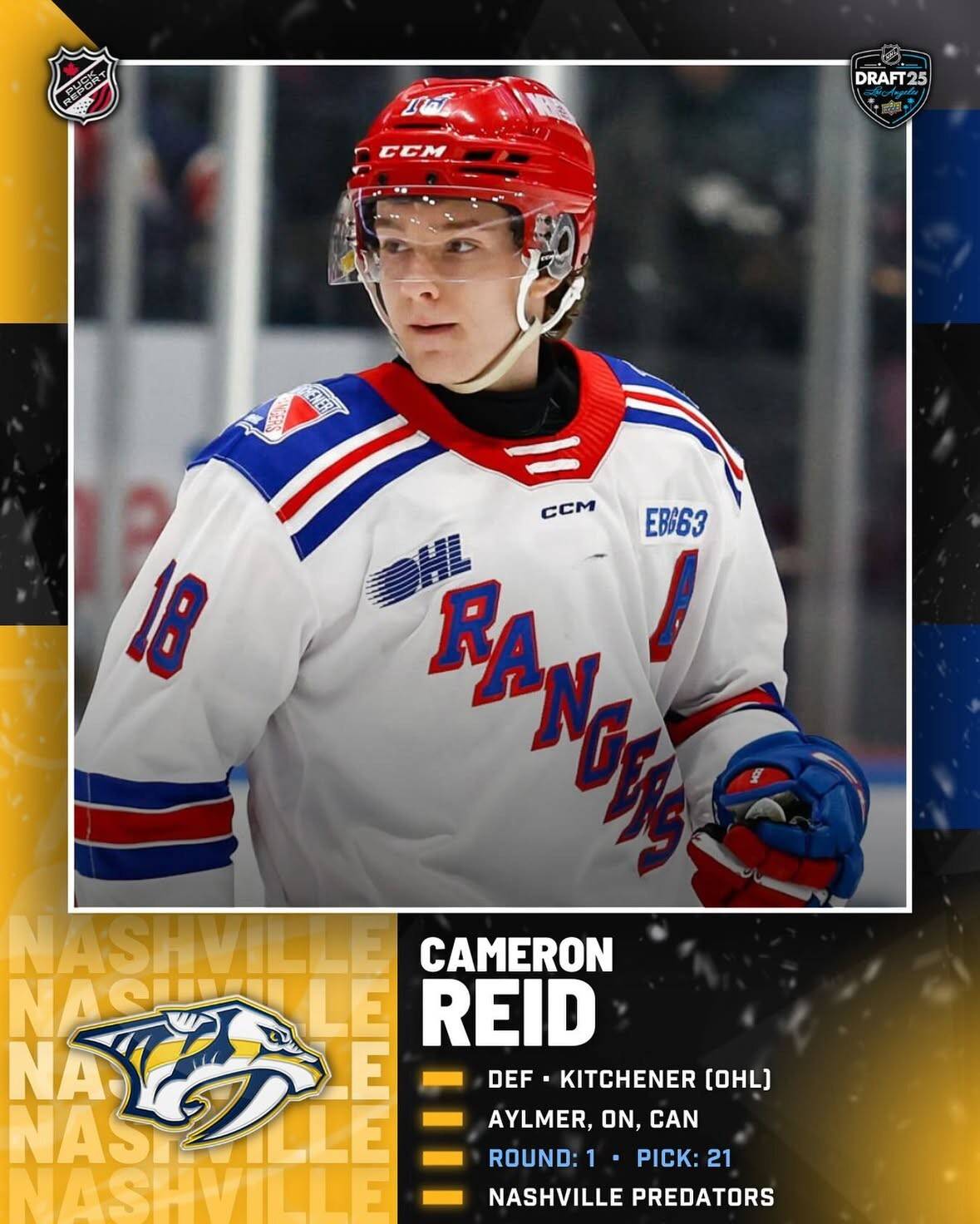 The Aylmer Minor Hockey Association would like to congratulate Aylmer's own Cameron Reid on being selected 21st overall in the 2025 NHL Entry draft to the Nashville Predators.